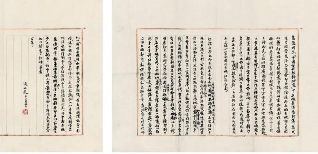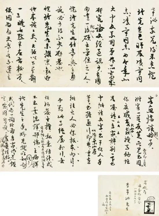 2018年6月20日由中國嘉德國際拍賣有限公司舉辦的“中國嘉德2018春季拍賣會”之“筆墨文章——信札寫本專場”拍出此信,共二紙,紙型不詳,橫置黑色毛筆豎寫。并附寄封,收信人信息是“西便門國務院宿舍八組四十六號 李希泌先生”,寄信人信息是“前門東大街三號科學院宿舍507號 沈”。郵戳中可辨識月日時間,為“7.5”,年份不可辨,待考。全信輯校如下: