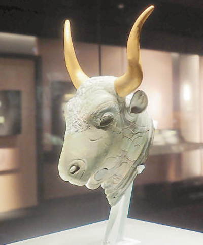 一件距今約3500年的公牛頭形綠泥石來通杯引人注目?!皝硗ā币辉~源于希臘語,意為“流淌”。很多古代文明都把來通杯用作祭酒器,其最大特征是器身上有注液口和出液口。這件公牛頭形來通杯注水口位于后頸部和左側(cè)牛角處,出水孔位于牛嘴。牛頭面部的毛發(fā)刻畫細(xì)膩,額頭處可見螺形發(fā)旋。獸頭形來通杯是一種珍貴物品,常被克里特島的統(tǒng)治者作為外交禮物贈(zèng)送給他國。希臘大陸出土的牛頭形來通杯和埃及第十八王朝法老墓壁畫上的來通杯圖像表明,這種器物在克里特島與地中海東部其他文明的交往中扮演了重要角色。