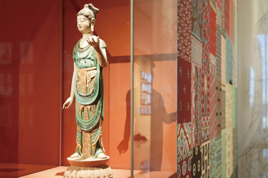 近日,北京又掀起一波“敦煌”熱,先是中國美術(shù)館拉開“墨韻文脈——甘肅絲路藝術(shù)珍品展”的帷幕,展覽匯聚敦煌研究院、甘肅省博物館、甘肅簡牘博物館以及中國美術(shù)館藏品240余件(套),涉及彩陶、簡牘、帛書、畫像磚、花磚、陶俑、木俑、寫經(jīng)、彩塑、臨摹壁畫等多個(gè)類別,勾勒絲綢之路上的綿長文脈。作為展覽的延伸內(nèi)容,“絲路歌韻:敦煌舞樂服飾展示專場”以歌舞與服飾展示相結(jié)合的形式,展現(xiàn)敦煌藝術(shù)的精神內(nèi)涵。二者相映生輝,吸引觀眾紛至沓來,可謂開展即是爆款。