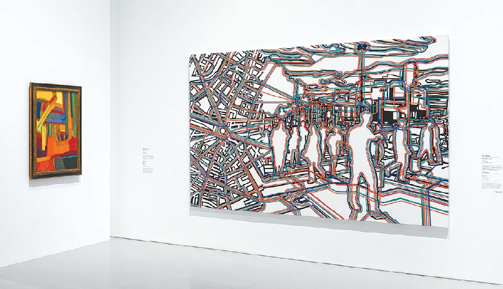 呈現(xiàn)鳥(niǎo)瞰多維視角的“俯瞰之景”板塊,顯得頗為典型??死锼沟侔哺嬖V記者,這些創(chuàng)作對(duì)應(yīng)著飛機(jī)發(fā)明及普及后給人們視角帶來(lái)的顯著變化。例如,讓·杜布菲創(chuàng)作于1944年的《幸福的鄉(xiāng)間》,盡管畫(huà)面的彩色方格色塊帶些抽象色彩,但讓人能感覺(jué)到田野的邊界,就像在飛機(jī)上眺望大地。熱拉爾·弗羅芒熱描繪自己巴黎工作室附近景觀的《巴士底網(wǎng)絡(luò)》,創(chuàng)作于2007年,畫(huà)面以縱橫交錯(cuò)的彩色線條勾勒的城市布局,乍一看有些像衛(wèi)星圖。“千禧年之后,智能手機(jī)、全球定位系統(tǒng)等新事物都出現(xiàn)了,這幅畫(huà)與街區(qū)衛(wèi)星地圖做了一個(gè)結(jié)合,說(shuō)明藝術(shù)家緊跟時(shí)代變化?!?/p>