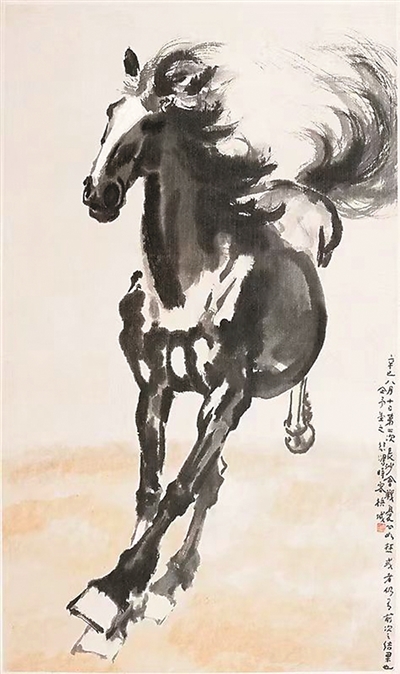 徐悲鴻筆下廣為人知的馬,也傳遞了畫家的情思。1941年秋第二次長(zhǎng)沙會(huì)戰(zhàn)期間,身在馬來西亞的徐悲鴻十分關(guān)注國(guó)內(nèi)戰(zhàn)況,創(chuàng)作畫作《奔馬》。畫面上的駿馬由遠(yuǎn)及近,騰空而起,昂首奮蹄,鬃毛飛揚(yáng),意氣風(fēng)發(fā),象征著中國(guó)人民在抗日戰(zhàn)爭(zhēng)中不屈不撓的精神和勇往直前的勇氣。畫上右側(cè)有題跋:“辛巳八月十日第二次長(zhǎng)沙會(huì)戰(zhàn),憂心如焚,或者仍有前次之結(jié)果也,企予望之,悲鴻時(shí)客檳城”,抒發(fā)了畫家的憂思之情。