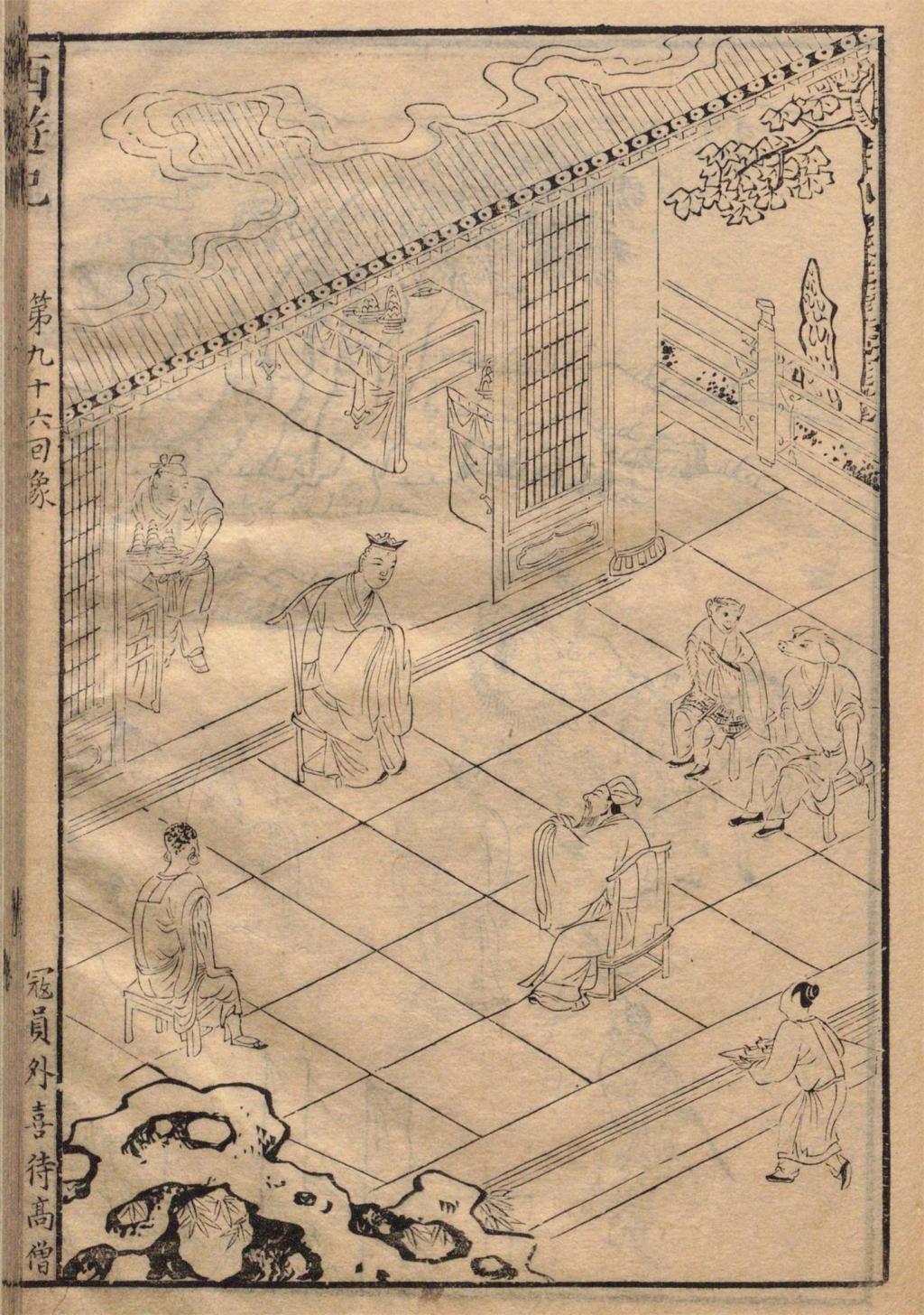 第96回 寇員外喜待高僧 唐長老不貪富貴。《李卓吾先生批評西游記》,可能是明萬歷時(shí)期金陵大業(yè)堂刻本,書前版畫191。