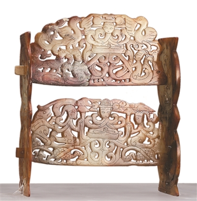 東漢透雕神仙故事玉座屏由4塊和田黃玉片插接而成,兩側(cè)支架為疊勝形,分別透雕青龍和白虎。中間兩屏片略呈半月形,兩端有榫插入架內(nèi),透雕神仙人物、祥禽瑞獸。上屏正中為西王母,分發(fā)高髻,憑幾端坐,旁有羽人、朱雀、九尾狐、三足烏等;下屏正中為東王公,發(fā)后梳,旁有羽人及熊、玄武等。玉屏風和座屏常見于記載,但考古出土的實物僅此一件,這也是考古發(fā)現(xiàn)的最早將人物、動物、景物合雕在一起的玉器,被列入《禁止出國(境)展覽文物目錄》。