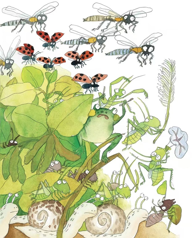 豆蟲想:逃跑我逃不過他們,裝死我有一套!他肚皮一挺,吧唧從豆葉上掉下去。