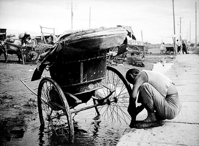 正在泥水里檢查車胎漏氣的車夫。雖然車況一般,但是比起打赤膊的車夫,這位車夫略顯文明,穿著一件背心,腰上還系著皮帶,從車廂上的銘牌能夠看出來“周記 六十三”的字樣。