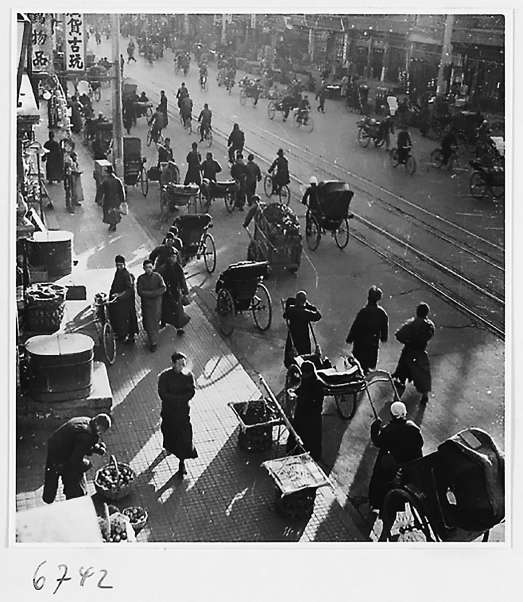 1933年,西單北大街行人、洋車、自行車交錯。此時已通電車,人們對洋車的需求越來越低。