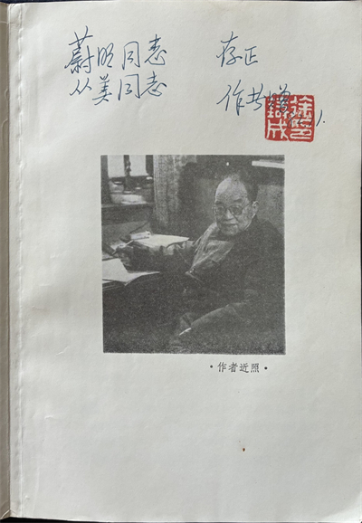 徐鑄成是文匯報(bào)的創(chuàng)辦人之一,1957年以后離開了《文匯報(bào)》,晚年曾來參加過《文匯報(bào)》的活動(dòng),依稀記得見過他的一個(gè)背影。手頭這本徐鑄成簽贈(zèng)給謝蔚明的《杜月笙正傳》,浙江人民出版社,1982年6月第一版,是我?guī)啄昵霸谂f書店淘到的。在“作者近照”的上方,徐鑄成鋼筆題寫:“蔚明同志、從美同志存正。作者贈(zèng),82.11.”鈐白文“徐鑄成印”。