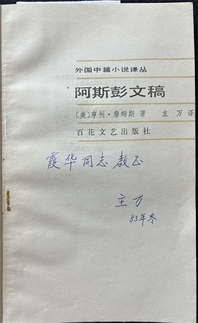 我買到的這本《阿斯彭文稿》,書名頁(yè)有譯者主萬(wàn)的題詞:“霞華同志教正。主萬(wàn),83年冬”。霞華應(yīng)該就是譯者曾經(jīng)的同事、華東師范大學(xué)外文系教授楊霞華,錢谷融的太太。錢谷融先生是很熟悉的,以前好多文學(xué)活動(dòng)都能見到他,慈眉善目、笑容可掬。而這位楊教授我無緣識(shí)荊。曾在吳俊的《追思我的導(dǎo)師錢谷融先生》一文中讀到,他們師生倆有次談到戀愛問題,錢先生對(duì)吳俊說:“我也有苦惱啊,楊先生有時(shí)發(fā)起脾氣來,會(huì)過來揪著我的耳朵從這個(gè)房間拉到那個(gè)房間。”吳俊寫道:“楊先生是我的師母,華東師大外語(yǔ)系的資深教授,年長(zhǎng)先生四歲,師母任副教授時(shí),先生還是小講師?!以谙壬依?,多次聽到隔壁楊先生直呼先生的名字,而先生說起師母則總是楊先生三字?!保S平主編《師大憶舊(華東師大卷)》,江蘇鳳凰文藝出版社,2022年1月版,73頁(yè))