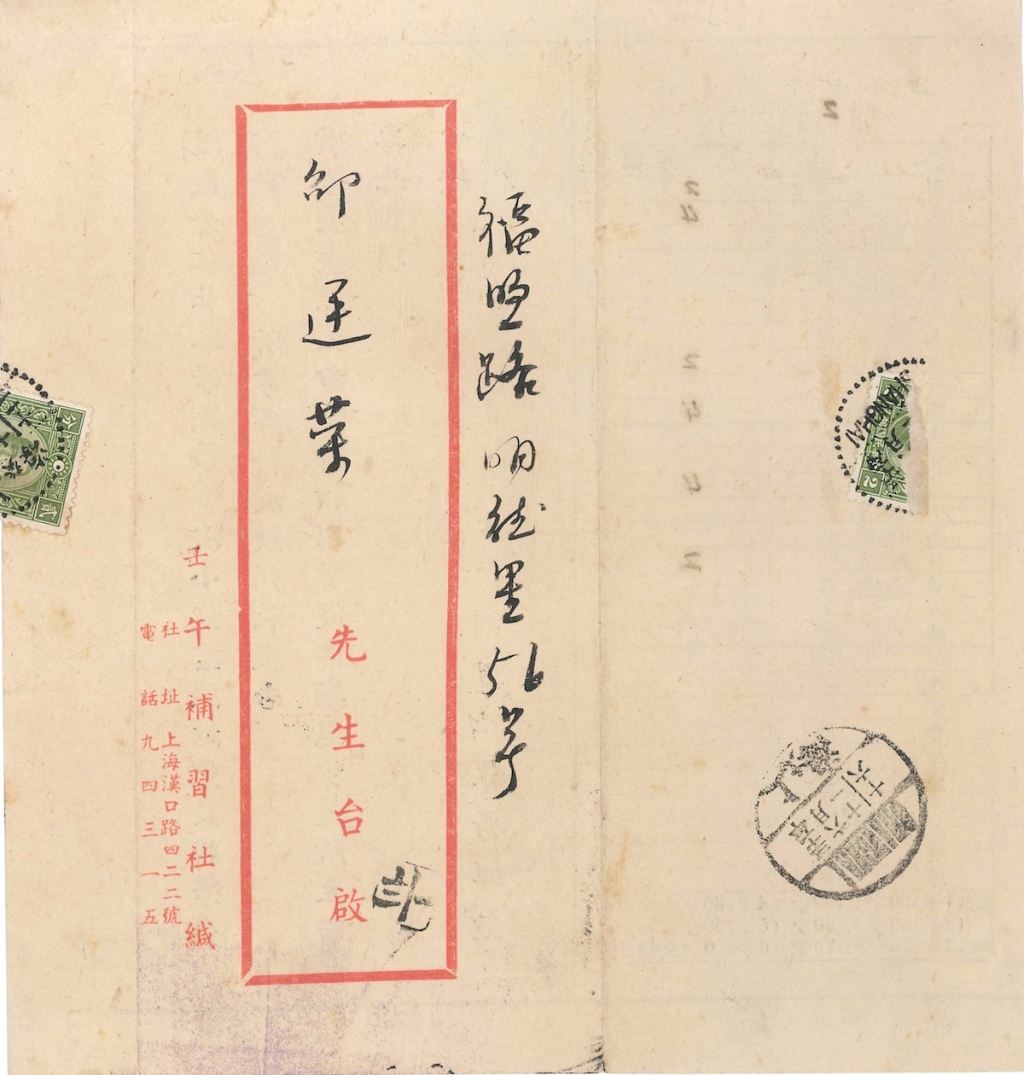 當然,這一成績單上還有幾處可注意之處:一者是邵貽裘在光華高中所上具體課程及成績,他們分別是國文(2)、英文(4)、大代數(2)、復習數學(4)、物理(4)、西洋文化(2),從成績單上的說明可知,學生的成績等第對應的分數分別是1等:90至100,2等:80至89,3等:70至79,4等:60至69。同時,這一成績單的外封上寫有“福煦路明德里56號邵廷榮先生臺啟”字樣,福煦路明德里56號無疑是邵貽裘的家庭住址,而邵廷榮當是邵貽裘的父親。此外,這封成績單寄出的時間為1942年6月,其外封上印有壬午補習社的地址是“漢口路422號”,此處的“漢口路422號”實為光華大學在抗戰(zhàn)中另一處寄居之地——上海證券大樓。