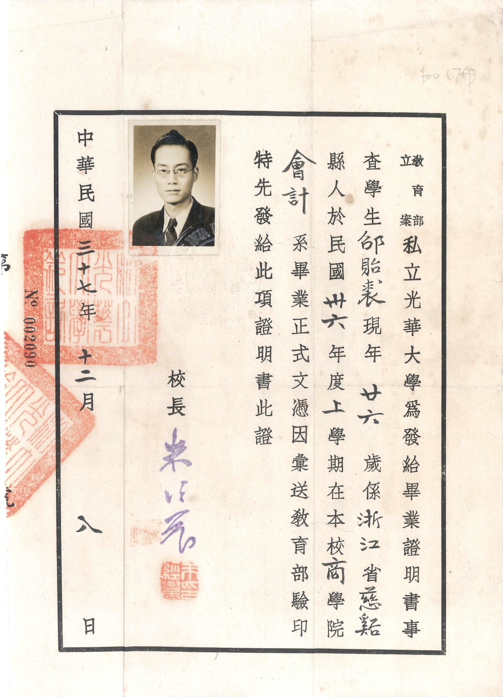 查學生邵貽裘現(xiàn)年廿六歲,系浙江慈溪縣人。于民國卅六年度上學期在本校商學院會計系畢業(yè),正式文憑因匯送教育部驗印,特先發(fā)給此項證明書,此證。