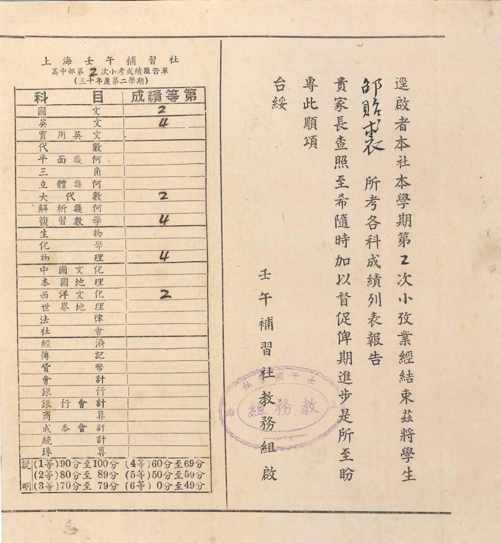 邵貽裘1938年從光華初中畢業(yè),那他是不是繼續(xù)在光華高中讀書呢?要解答這一問題,我們在這批邵貽裘的文獻中找到一件題為《壬午補習社高中部第2次小考成績報告單》的文獻,這一成績單的內容見下: