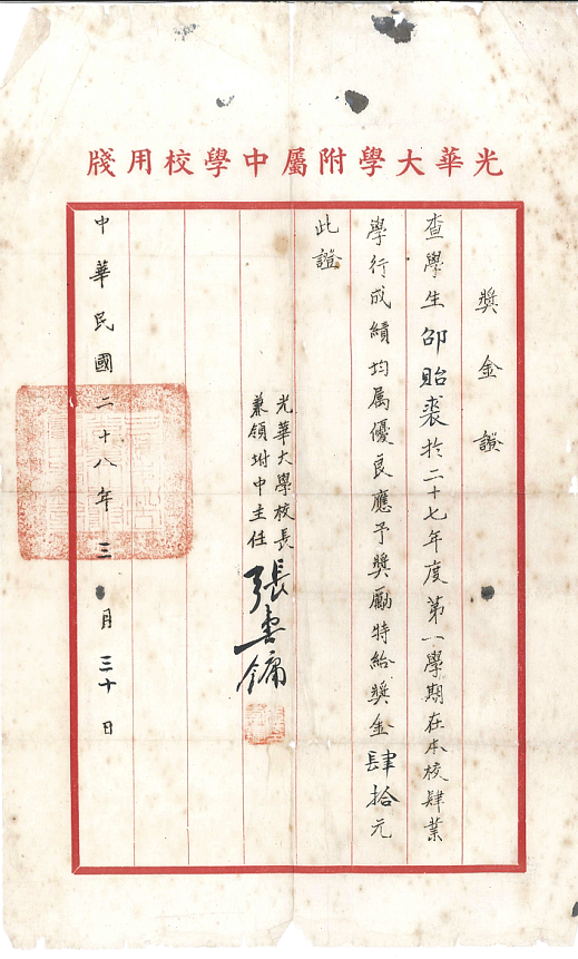 邵貽裘的《光華大學附屬初中獎金證》,是他與光華大學的最早聯(lián)系的見證。這件頒發(fā)于1939年的《獎金證》的內容見下: