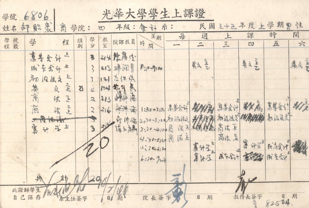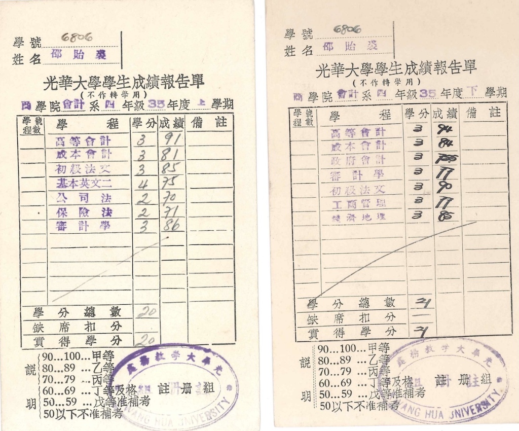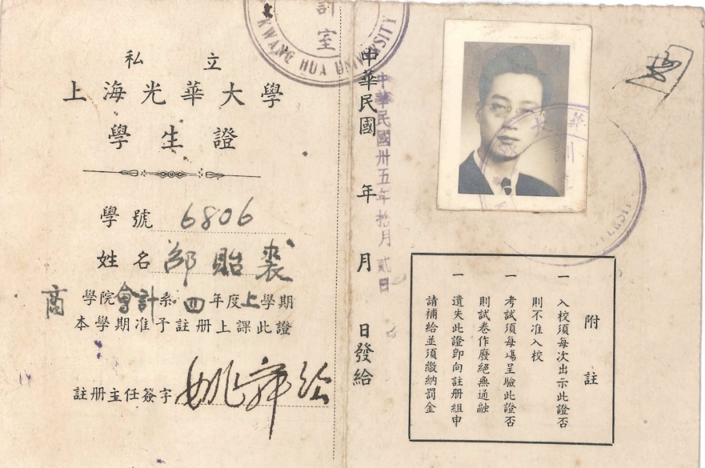 1945年抗日戰(zhàn)爭勝利,因當時上海商業(yè)較發(fā)達,父親又從事商業(yè),認為學習商科有出路,因此轉入本市漢口路證券大樓私立光華大學商學院會計系三年級讀書,學習頗有成績。1947年8月?lián)喂馊A大學商學院會計系助理,1947年12月大學畢業(yè)。因學習成績優(yōu)良,本校留用,擔任光華大學商學院會計系專任助教及講師職,直至上海解放。