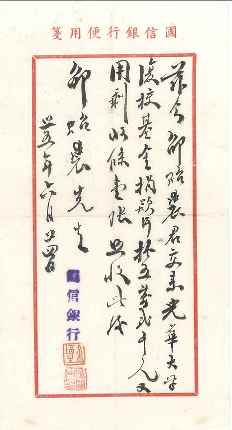 這一畢業(yè)證明文獻提供給我們一些邵貽裘的基本信息,比如他從光華大學畢業(yè)的時間為1947年的上學期,他1948年的畢業(yè)證明上寫有他二十六歲的字樣,那么,他的出生年齡就是1922年,他的籍貫為浙江慈溪等等。當然,更重要的是,通過拼合包括畢業(yè)證明在內的邵貽裘文獻,我們大體上能還原他從初中、高中直至大學的學習經歷,從1939年到1948年近九年中,邵貽裘先后輾轉于光華初中(1937-1938)、壬午補習社(即光華高中,1939-1942)、大同大學工學院(1942-1944年)、光華大學商學院(1945-1948),盡管在九年的學習時光中,邵貽裘也曾有游離在光華大學之外的經歷。但不可否認的是,光華大學及其附中一直是他學生生涯的主軸線,他的生命已然被烙上了深深的光華印記。同時,我們在這批文獻中還發(fā)現(xiàn)一件頗有意義的文件,一份用國信銀行便用箋寫就的光華大學復?;鹁杩钭C明,內容是這樣的: