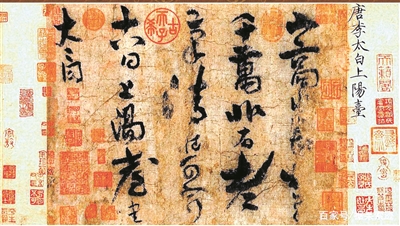 《上陽臺帖》在唐代無記載,宋時為宋徽宗所藏,此后一直在主流文化圈中,輾轉于各朝各代帝王、名家之手,均被視若珍寶。宋徽宗曾鑒定為李白真跡,并以瘦金體題跋稱其“字畫飄逸,豪氣雄健”,字跡如飛瀑傾瀉,縱放自如。