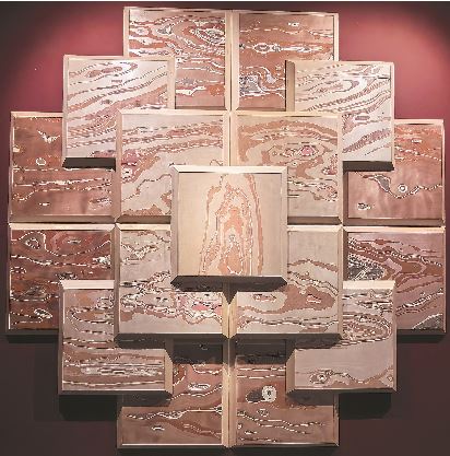 “披云似有凌霄志,向日寧無(wú)捧日心?!绷柘龌ㄗ怨艦槿藗冪姁?ài),付云飛在邂逅的剎那就愛(ài)上了它,飽含熱情畫(huà)下了大尺幅的《山花爛漫》。朱砂渲染的絢爛花簇從一整塊大石上披掛、垂落下來(lái),洋洋灑灑,頗為可觀,大寫(xiě)意的山石構(gòu)制,間以小寫(xiě)意的筆觸點(diǎn)染,疏朗大氣之中,不失優(yōu)雅與浪漫。恣意綻放的花朵和遒勁有力的藤蔓,被大石整合在一個(gè)完整的畫(huà)面之內(nèi),與石上山雀相呼應(yīng),傳遞出中國(guó)畫(huà)形神兼?zhèn)?、虛?shí)相生的筆墨意趣和人文內(nèi)涵?!斗谴朔潜恕窂钠椒仓邪l(fā)掘美。拋開(kāi)一切附加之物,站在21塊棕色調(diào)正方板材錯(cuò)落排布的作品前,舒服和美之感油然而生。天然的紋理、如詩(shī)的圖案、和諧的色彩,均由作者在廉價(jià)的三合板上完成。在手工拋光至兩萬(wàn)目后,這些久被忽視的板材逐次蘇醒、開(kāi)口歌唱,既袒露出樸拙的表情和天然的紋理,順著紋理雕刻下去,又袒露出深淺不一的豐富色彩??痰吨掳纪褂兄?,宛若天成,不著痕跡,遠(yuǎn)觀如長(zhǎng)河落日的荒漠大野,又如混沌初開(kāi)的天地造化,莊嚴(yán)神秘又靈動(dòng)不拘,層層解構(gòu),層層驚喜,是藝術(shù)家匠心獨(dú)具的創(chuàng)造,亦是板材久被遮蔽的本有詩(shī)意。
