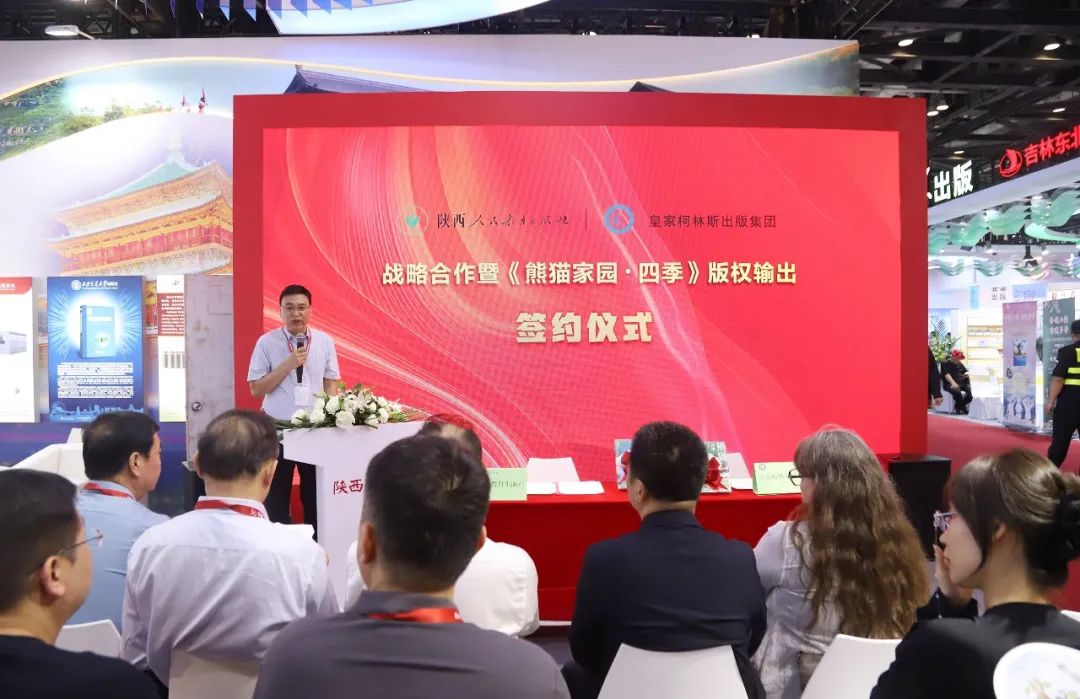 活動中,陜西人民教育出版社社長李曉明介紹了相關(guān)情況,并與葛妮代表雙方簽署戰(zhàn)略合作協(xié)議和《熊貓家園?四季》版權(quán)輸出協(xié)議。