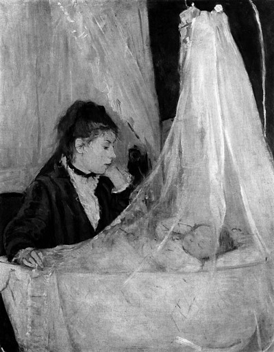 莫里索1841年生于法國中部一個顯赫家庭,父親是高級官員,母親來自洛可可藝術(shù)世家。莫里索和姐姐艾德瑪自幼得到吉夏爾等學(xué)院派畫家指導(dǎo),萌生了對美術(shù)的興趣。姐妹倆出色的天賦很快令家庭教師驚嘆并自認教無可教。1852年莫里索隨家人遷居巴黎,自此常到盧浮宮臨摹大師作品,系統(tǒng)掌握了古典肖像畫、風俗畫的技法。在當時的法國社會中,女性一律不得進入高等美術(shù)學(xué)院接受教育,也不被允許雇傭模特或外出寫生。繪畫對莫里索姐妹而言,只是淑女教育的一項課程和娛樂消遣的一種雅好。艾德瑪在學(xué)畫過程中原本受到更多稱贊,但成年后嫁與軍官并搬離巴黎,也就不再作畫,而莫里索對美術(shù)始終保持著熱愛。1861年她師從巴比松畫派的卡米耶·柯羅,這成為她從藝的轉(zhuǎn)折點??铝_所授的對景寫生,對莫里索而言是一種新鮮的創(chuàng)作體驗,更是一種走近自然、師法自然的藝術(shù)理念。幾年間她陸續(xù)畫出了《諾曼底的茅草屋》《瓦茲河岸》《奧弗古路》等出色的風景畫,這些作品自1864年起多次入選法蘭西美術(shù)院主辦的全國畫展。這一官方美術(shù)展自17世紀起就是全國青年畫家競相追逐的成名之路,莫里索受官方沙龍認可的程度,使當時作品屢次遭拒的其他印象派先驅(qū)望塵莫及。比在藝壇嶄露頭角更可貴的是,莫里索在創(chuàng)作這些風景畫的過程中,悟到了如何捕捉自然界中隨光線變化而瞬間出現(xiàn)的鮮活色彩——日光斑駁、樹影婆娑、波光粼粼……她又將這些寫生所見的美妙光色運用到對家庭場景的描繪中,畫技日益精進。