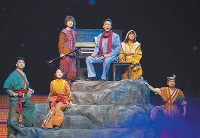 “大人們?nèi)ゴ蛘?,就是為了讓你們——可以有別的選擇。”舞臺上,冼星海對延安魯迅藝術(shù)學(xué)院里學(xué)唱歌謠的小戰(zhàn)士們堅定訴說。轉(zhuǎn)眼,舞臺背景,黃河滔滔,舞臺上方,紅旗飄飄,燈光將整個劇場染成一片金色?!氨Pl(wèi)家鄉(xiāng)!保衛(wèi)黃河!保衛(wèi)全中國!”延安歌舞劇團(tuán)的演員們齊聲高歌,臺下觀眾激揚(yáng)合唱。