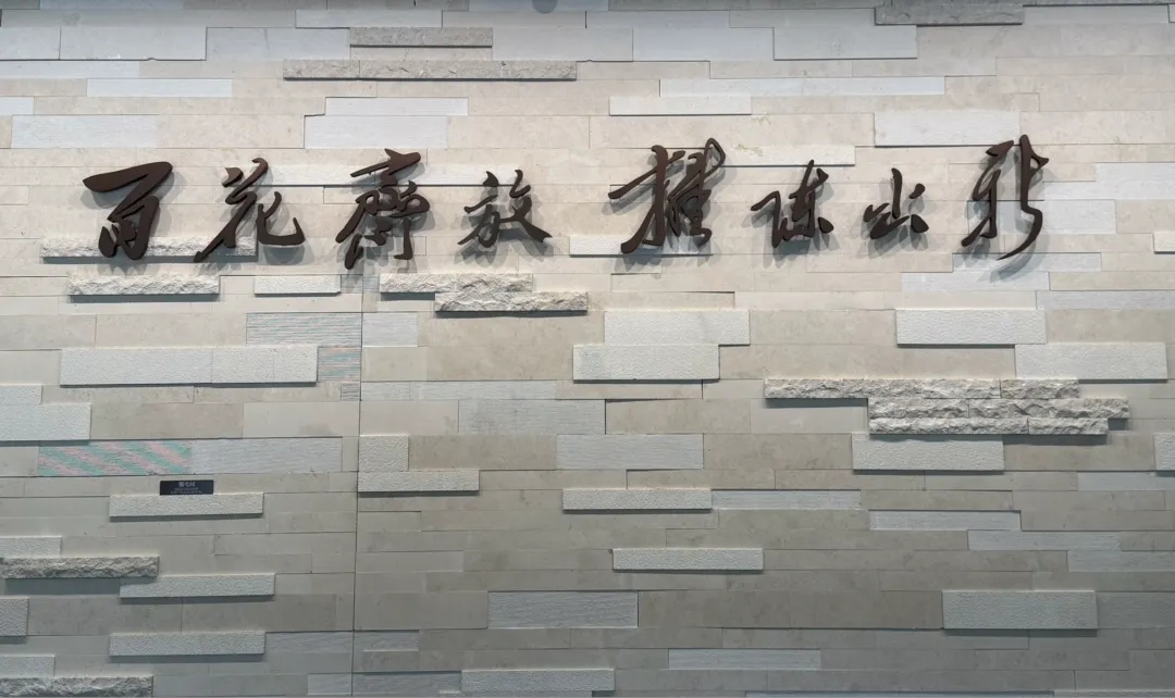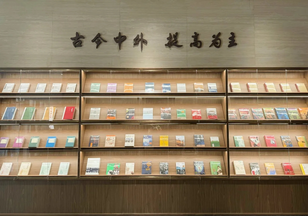 步入新大樓,前臺(tái)及左側(cè)的圖書(shū)展示墻上,“百花齊放 推陳出新”“古今中外 提高為主”的出版方略赫然在目。