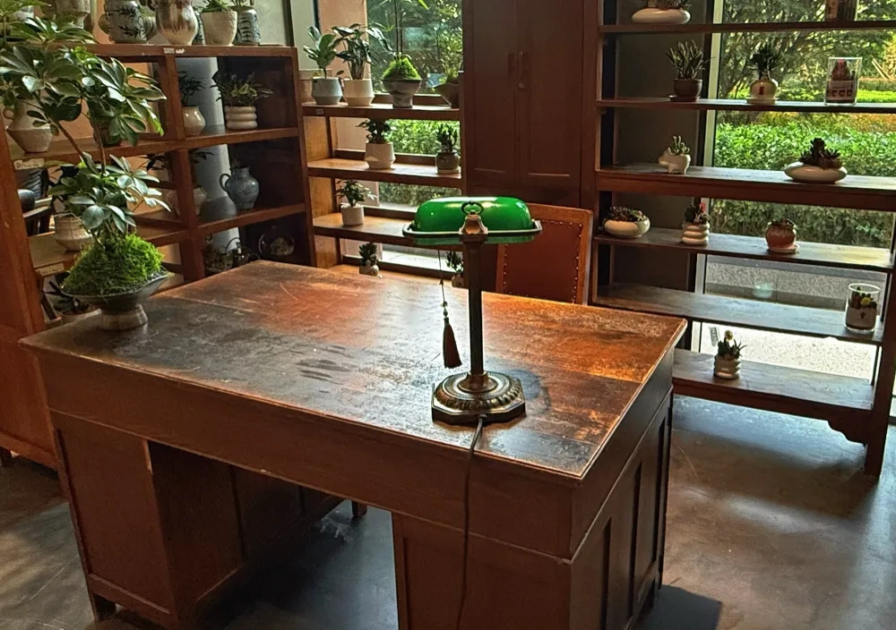 一層右側(cè)的朝花夕拾·文創(chuàng)咖啡供銷(xiāo)社率先開(kāi)業(yè),空間敞亮,更顯古樸雅致。店門(mén)口,一套從朝內(nèi)166搬來(lái)的辦公桌椅和書(shū)架靜靜陳列,桌上那盞熟悉的綠色玻璃罩臺(tái)燈,柔光流淌,瞬間將人拉回朝內(nèi)166的舊時(shí)光——仿佛一切從未改變。