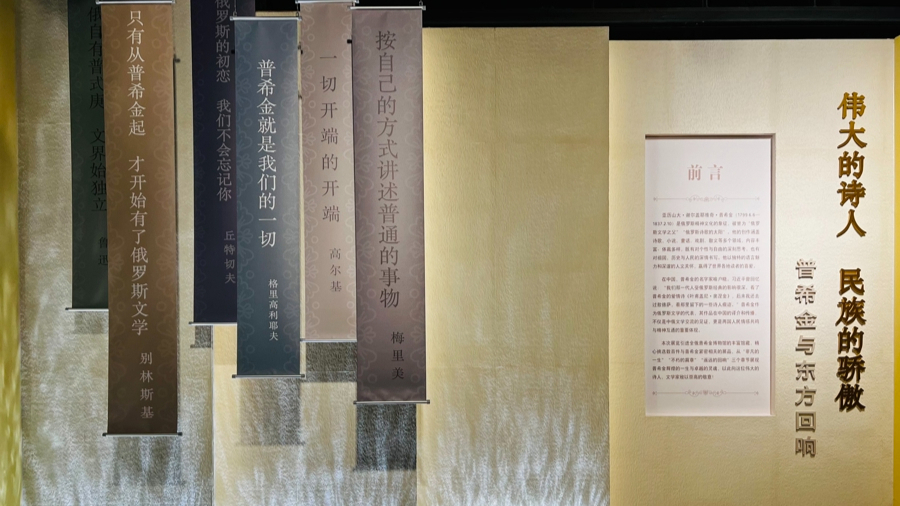 系列互動裝置吸引讀者走進普希金的文學世界,回顧其一生璀璨的創(chuàng)作成就。展覽入口處,一條條懸掛的語錄條幅上,書寫了多位文學評論家對普希金的贊譽。這些評語在3D動態(tài)水紋燈的映襯下,宛如通往詩人世界的導(dǎo)引,為觀眾開啟一場跨越時空的對話。高爾基稱之為“一切開端的開端”,丘特切夫評價其是“俄羅斯的初戀 我們不會忘記你”,別林斯基說“只有從普希金起 才開始有了俄羅斯文學”,格里高里耶夫甚至驚呼“普希金就是我們的一切”……