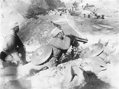 1940年8月20日至1941年1月24日,八路軍在華北對(duì)日軍發(fā)動(dòng)一次大規(guī)模的進(jìn)攻,陸續(xù)參戰(zhàn)部隊(duì)達(dá)105個(gè)團(tuán)20余萬(wàn)人,稱(chēng)為百團(tuán)大戰(zhàn),沉重打擊了日軍的侵略氣焰。圖為山西陽(yáng)泉獅垴山戰(zhàn)斗中的八路軍機(jī)槍陣地。
