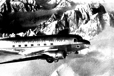 從1942年5月至1945年9月,絕大部分同盟國(guó)援華軍用物資自印度汀江通過(guò)“駝峰航線(xiàn)”運(yùn)到昆明,共向中國(guó)運(yùn)輸戰(zhàn)略物資80多萬(wàn)噸。圖為在雪峰間穿行的C—47運(yùn)輸機(jī)。