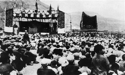 全民族抗戰(zhàn)爆發(fā)后,紅軍主力改編為八路軍,南方八省紅軍游擊隊(duì)改編為新四軍(瓊崖紅軍游擊隊(duì)除外)。正面戰(zhàn)場(chǎng)國(guó)民黨軍隊(duì)頑強(qiáng)抗擊日軍進(jìn)攻,中國(guó)共產(chǎn)黨領(lǐng)導(dǎo)的人民抗日武裝向敵后實(shí)施戰(zhàn)略展開(kāi),開(kāi)辟敵后戰(zhàn)場(chǎng)。圖為紅軍改編后舉行抗日誓師大會(huì)。