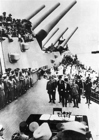 1945年8月15日,日本宣布無(wú)條件投降。9月2日,在東京灣的美國(guó)“密蘇里”號(hào)戰(zhàn)列艦上,舉行日本向同盟國(guó)投降簽字儀式。圖為日本投降簽字現(xiàn)場(chǎng)。