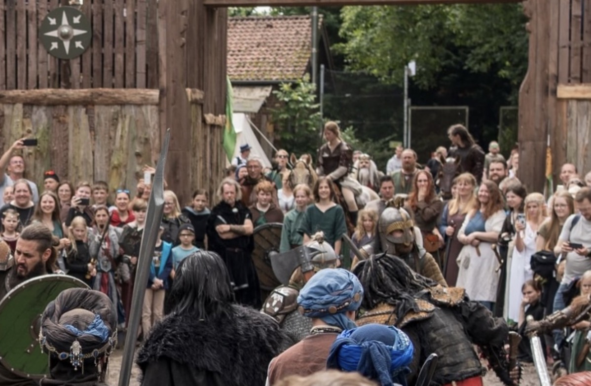 五月末,我抵達(dá)德國(guó)北威州的Geldern,正逢一年一度的托爾金節(jié)。下火車后,我步行穿過(guò)一片林地,遠(yuǎn)遠(yuǎn)地看見(jiàn)草地上升起了帳篷,煙火繚繞,有人在河邊磨面,有人在棚下用古式木工打造手斧,有孩子身著霍比特服飾在泥地上追逐。一時(shí)間,我并不覺(jué)得自己“進(jìn)入了中土”,而是仿佛走進(jìn)了一場(chǎng)確實(shí)存在于歷史里的村落節(jié)慶,沒(méi)有現(xiàn)代音樂(lè),沒(méi)有熒光色,沒(méi)有塑料。只有火堆、吟唱、木頭、弓箭,以及手寫的精靈語(yǔ)標(biāo)牌,認(rèn)真的,不容嘲諷的。