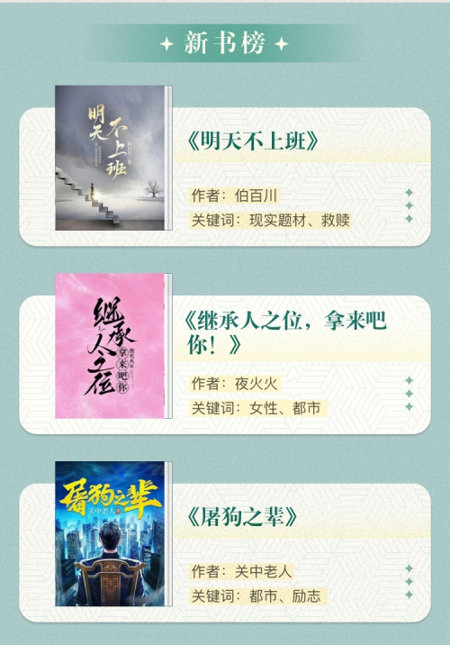 在新書榜中,三部新作實(shí)現(xiàn)題材與價值表達(dá)突破。都市科幻作品《明天不上班》以企業(yè)荒誕文化為切入點(diǎn),將勞動異化與現(xiàn)代性焦慮融入懸疑敘事;《繼承人之位,拿來吧你!》打破傳統(tǒng)豪門商戰(zhàn)文套路,塑造具經(jīng)濟(jì)學(xué)思維的新女性形象;《屠狗之輩》聚焦底層草根奮斗,探討社會公平與奮斗價值。