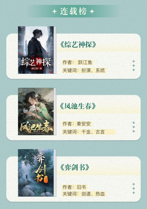 連載榜三部作品在類型深耕中創(chuàng)新。《綜藝神探》以“系統(tǒng)流”爽文載體,平衡犯罪刑偵題材的娛樂性與思想性;《鳳池生春》將爽文機(jī)制與女性主體意識覺醒融合,為宅斗題材注入新內(nèi)涵;《弈劍書》憑借沉穩(wěn)敘事與群像刻畫,構(gòu)建自洽武林體系,成群像武俠創(chuàng)作范本。