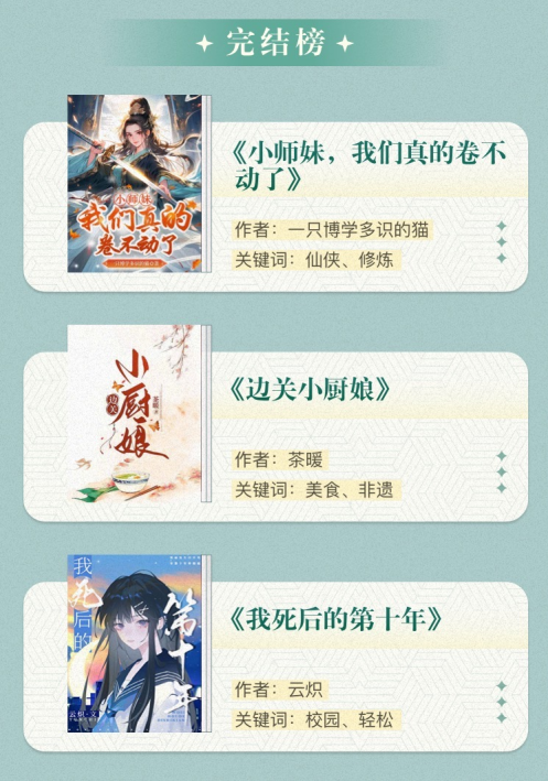 完結(jié)榜作品則以輕類型承載深內(nèi)涵。《小師妹,我們真的卷不動了》以反套路修真敘事重構(gòu)仙俠表達(dá);《邊關(guān)小廚娘》借美食觀照社會,于日常敘事中沉淀精神內(nèi)核;《我死后的第十年》融合甜寵與雙向救贖元素,成為都市幻想題材佳作。