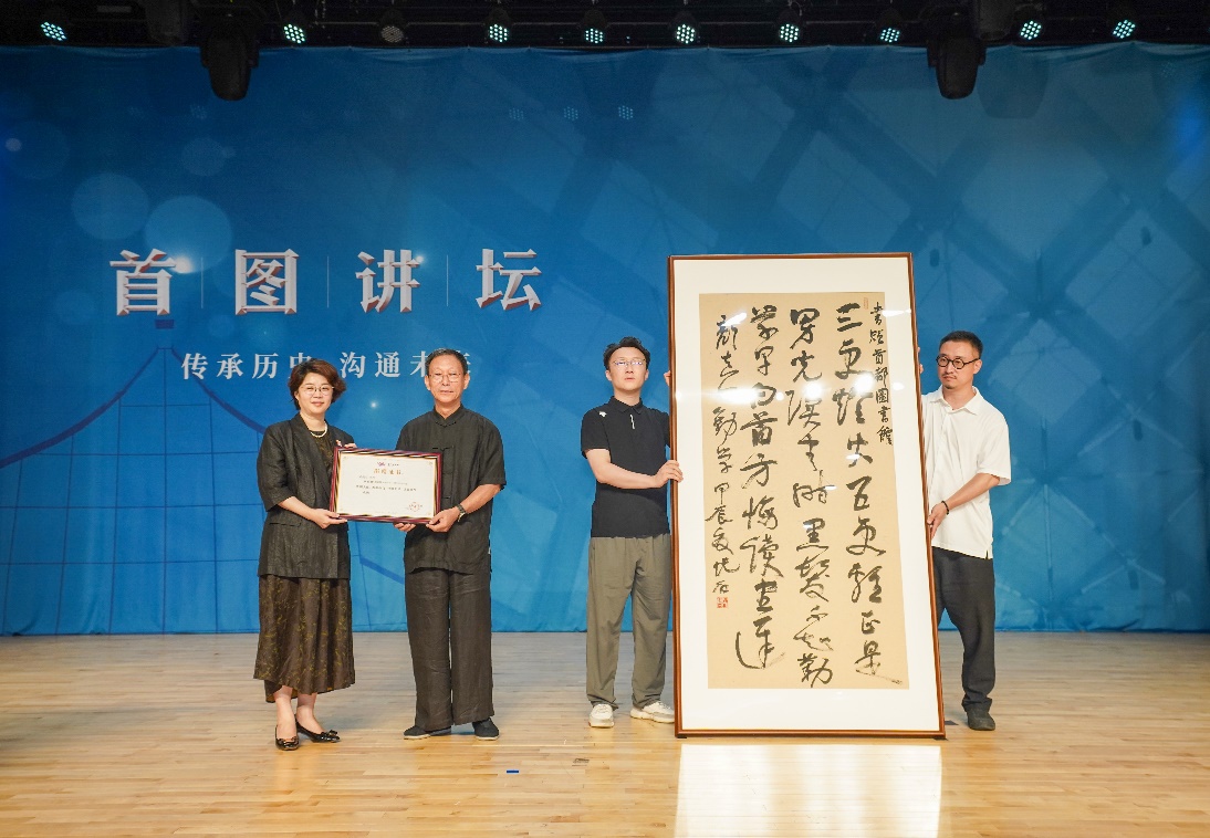 吳悅石先生(左二)向首都圖書館捐贈書法作品《勸學(xué)·顏真卿》
