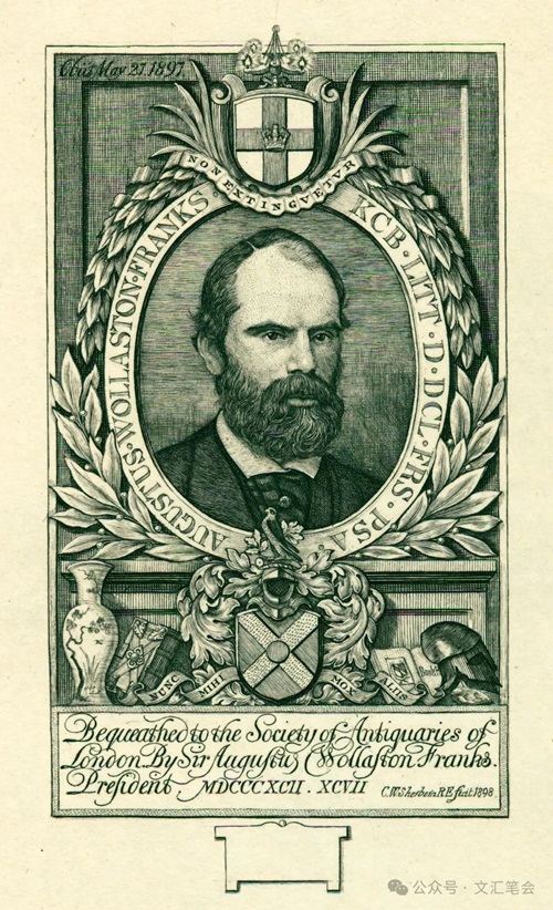 有“大英博物館第二創(chuàng)始人”之稱的弗朗克斯是當時收藏藏書票數(shù)量最多的個人。這是用于弗朗克斯遺贈倫敦古物學會書籍所用的藏書票,在票主去世次年作成。中央橢圓框內(nèi)是弗朗克斯肖像,沿像框的文字是“奧古斯都·沃拉斯頓·弗朗克斯,巴斯騎士,文學博士,民法博士,皇家學會會員,古物學會主席”。上方為倫敦古物學會紋章,有學會的拉丁文銘文“綿延不絕”;下方為弗朗克斯紋章,銘文為“暫得于己倏忽去之”,其兩邊有花瓶、書籍、藏書票冊等。下部文字寫明遺贈之事:由1892—1897年主席奧古斯都·沃拉斯頓·弗朗克斯爵士遺贈倫敦古物學會。后接藏書票作者署名。矩形外框左上角有拉丁文:1897年5月21日去世。
