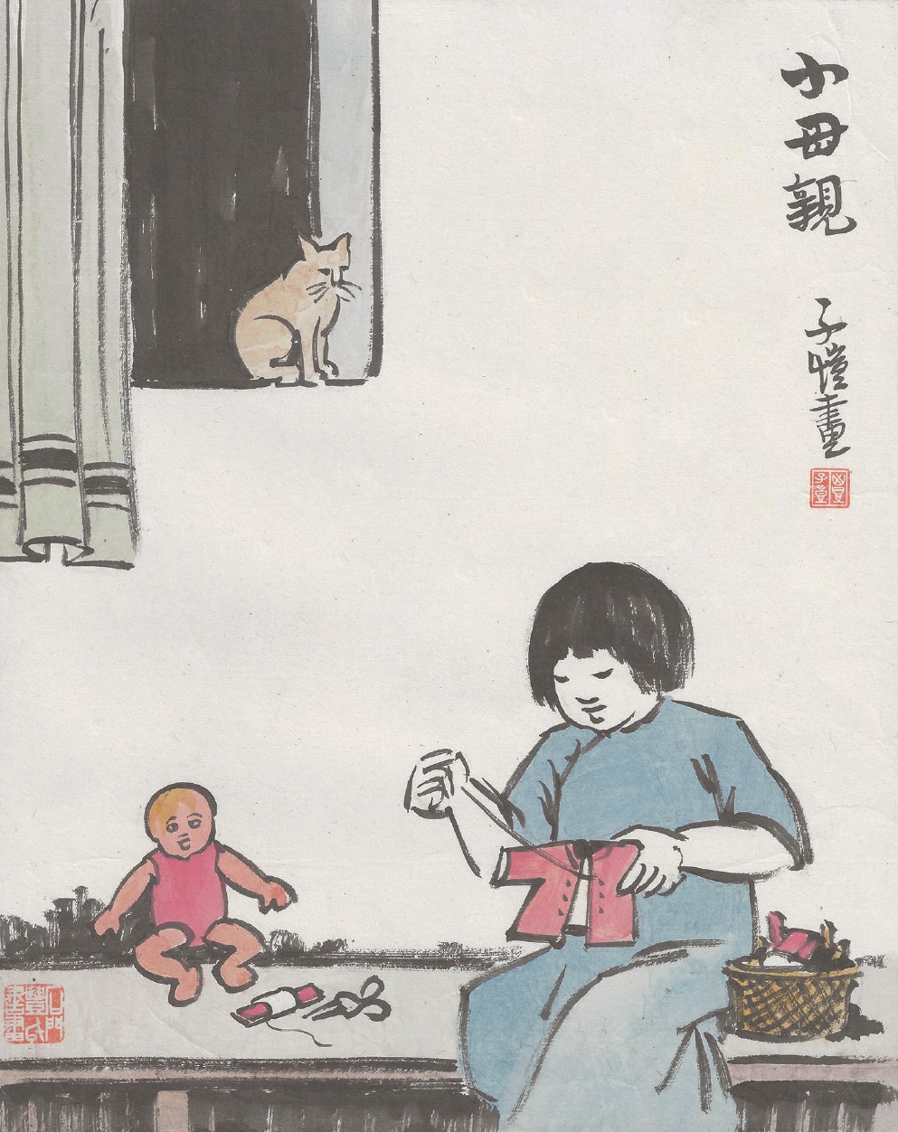 踱步于展廳,觀眾很難不被豐子愷眾多天真爛漫、溫暖人心的畫作所感染。例如,坐在窗邊、給布娃娃興致勃勃縫著小衣衫的女孩,被畫成了《小母親》;屋外挨個(gè)搬著小板凳、將它們排成列的小男孩,被畫成了《螞蟻搬家》;《夜花深處一燈歸》是雋永的剪影,聚焦夜色中提燈行走的兩姐妹;《梁上燕》以憑欄望向遠(yuǎn)方落花、飛燕的女子背影,予人無(wú)盡遐想……