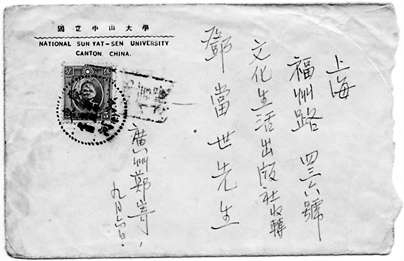 這封信使用的是國(guó)立中山大學(xué)的信封。根據(jù)史料,1934年,中山大學(xué)由原來(lái)的廣州市區(qū)文明路遷往廣州近郊的石牌。信封上的郵戳,有“廣東 廿?年九月七日 沙(東)河”的字樣,其中的“沙(東)河”為當(dāng)時(shí)石牌中山大學(xué)所隸屬的郵政分局的名稱(chēng)。
