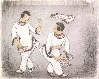 左側(cè)女子著白底紅花褲,梳雙發(fā)髻,左手拈蘭花指,手腕上的玉鐲很顯眼,右手持紅花折扇。右側(cè)女子右手執(zhí)幡,左手拿著長(zhǎng)流蘇的紅花折扇。紅花、蘭花指和鐲子,讓人看到柔美、矜持和幸福??梢韵胂螅鹞钑r(shí)裝飾與流蘇伴隨舞姿流轉(zhuǎn),幻化出多層流動(dòng)花海。
