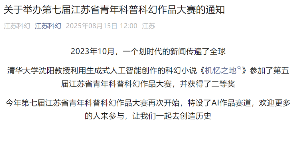 記者注意到,這一屆科普科幻作品大賽中新增了AI作品賽道,在征集要求中說(shuō)明AI科幻作品賽道鼓勵(lì)參賽者通過(guò)AIGC技術(shù)進(jìn)行科幻文學(xué)創(chuàng)作,主題自擬,提交作品時(shí)需附所使用的AIGC使用報(bào)告,用于佐證作品是使用生成式人工智能進(jìn)行的創(chuàng)作。除該賽道外,其余科普科幻作品均不可使用生成式人工智能輔助創(chuàng)作。