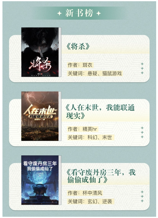 在新書(shū)榜中,三部新作使用了創(chuàng)新的敘事與結(jié)構(gòu)。懸疑探案作品《將殺》設(shè)定主角患上“間歇性失憶癥”形成“不可靠敘事”,引導(dǎo)讀者在反轉(zhuǎn)中重構(gòu)對(duì)人物與案件的認(rèn)知;《人在末世,我能聯(lián)通現(xiàn)實(shí)》以獨(dú)特的雙時(shí)空設(shè)定突破傳統(tǒng)末世題材的敘事窠臼,構(gòu)建出跨越十余年時(shí)空的協(xié)作與互助框架;《看守廢丹房三年,我偷偷成仙了》巧妙融合修仙元素與現(xiàn)代網(wǎng)文爽感邏輯,使故事呈現(xiàn)獨(dú)特節(jié)奏和層次感。