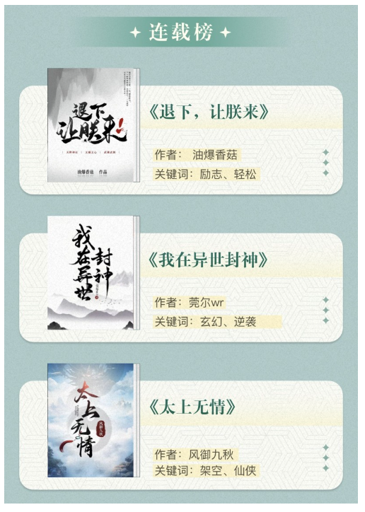 榜單延續(xù)遴選兼具文化深度與市場(chǎng)潛質(zhì)的優(yōu)質(zhì)佳作的核心理念,持續(xù)彰顯平臺(tái)在網(wǎng)絡(luò)文學(xué)價(jià)值引領(lǐng)上的恒心與定力。本期上榜作品經(jīng)過(guò)精心篩選,既展現(xiàn)出當(dāng)下網(wǎng)絡(luò)文學(xué)在題材與風(fēng)格上的多元探索,也在專家評(píng)審的深度解讀下,進(jìn)一步釋放其文學(xué)魅力與行業(yè)價(jià)值。