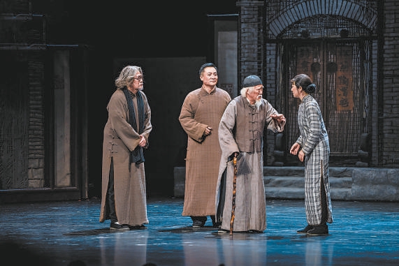 在天橋藝術(shù)中心上演的國話版《四世同堂》劇照,左起分別為錢默吟、祁 瑞 宣、祁 老人、韻梅。周毅然 房媛媛攝影