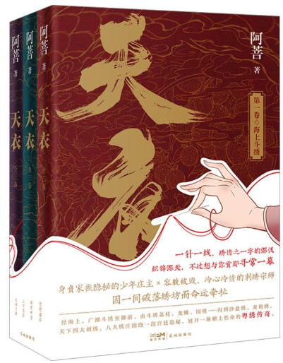 《天衣(全三卷)》包括《海上斗繡》《廣潮斗繡》《龍袍斗繡》,以有1000多年歷史、中國四大名繡之一的粵繡(即廣州刺繡、潮州刺繡)行業(yè)的發(fā)展為故事背景,從明“隆慶開關(guān)”出發(fā),以伊麗莎白一世促成英國刺繡同業(yè)公會為結(jié)束,講述了一個從海上、民間到天子座前的斗繡傳奇。
