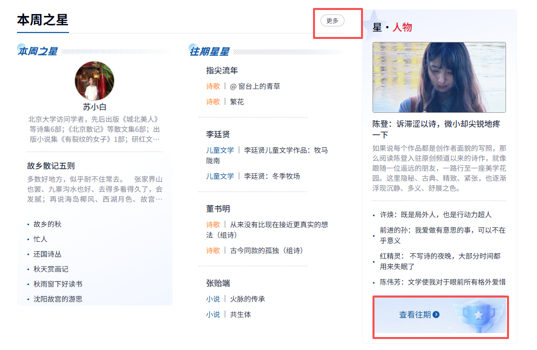 “本周之星”欄目的顯示內(nèi)容則變得更加豐富了,除了當期的“本周之星”,也可以同步顯示往期的四位,點擊右上角“更多”進入“本周之星”列表頁,查看所有“本周之星”內(nèi)容。