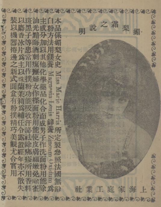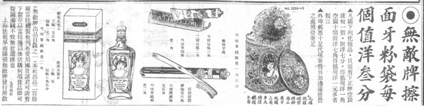 盡管家庭工業(yè)社積極在南洋開拓海外市場,但目前沒有材料表明其產(chǎn)品遠(yuǎn)銷歐洲,因此“法國里昂”之說無從考證。有意思的是,以上材料將媚梨霜與以化妝品著稱的法國捆綁,不僅為家庭工業(yè)社營造出一種國際品牌的印象,更重要的還有稅收減免的政策紅利,這對一家正處于起步階段的企業(yè)來說,不可謂不重要,因此“媚梨女史”定制可能只是一種營銷的噱頭。其實(shí)《申報(bào)》早在前一年就刊登過媚梨霜的廣告,但是化妝盒身并沒有西洋女子的畫像(例如1921年10月4日),前述的國際化包裝或許是為了打開銷售局面才在后來推出的。