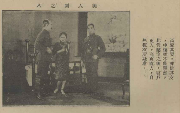 圖9 《美人關(guān)》劇照之一,展現(xiàn)高人杰、胡媚梨、尚劍帆的三角關(guān)系(圖片來源:《明星特刊》1928年第29期)
