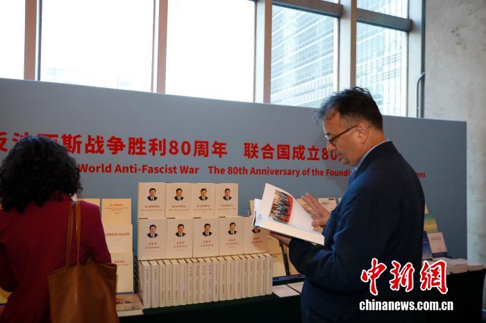 聯(lián)合國總部觀眾閱讀《習(xí)近平談治國理政》。 中新社記者 廖攀 攝