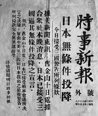 事實(shí)上,早在1945年8月10日,日本政府即已分別電請(qǐng)中立國(guó)瑞典、瑞士,將其投降之意愿轉(zhuǎn)達(dá)中、美、英、蘇四國(guó),“日本政府決定無(wú)條件投降”的消息遂通過(guò)無(wú)線電波傳遍世界。當(dāng)時(shí),身處中國(guó)西南一隅的陳寅恪,究竟通過(guò)何種渠道獲知此訊,至今尚未見(jiàn)有確切的考證予以說(shuō)明。不過(guò),僅據(jù)筆者所知所見(jiàn),抗戰(zhàn)期間將總部從上海遷至重慶的《時(shí)事新報(bào)》,確曾于1945年8月10日這一天下午印發(fā)過(guò)一份“號(hào)外”,日本無(wú)條件投降的消息,就赫然印于這份“號(hào)外”之上。當(dāng)晚成渝兩地民眾可憑此“號(hào)外”,較早獲悉這一消息,確為事實(shí)。