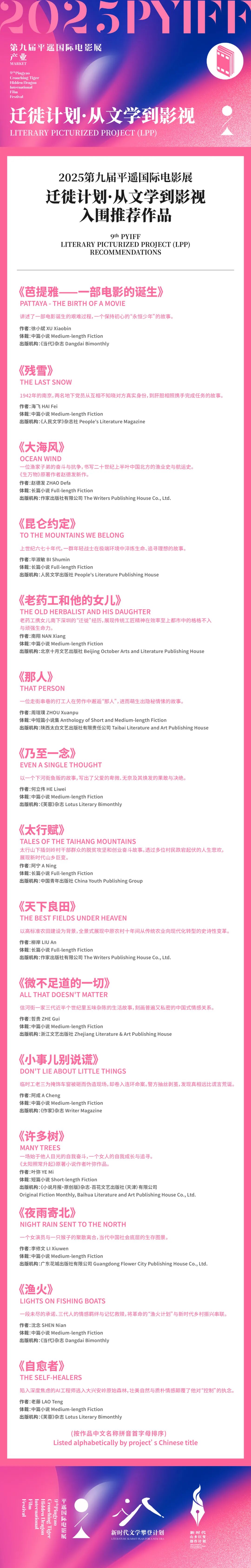 本屆電影展“遷徙計劃·從文學(xué)到影視”最終入圍的推薦作品囊括近年極具影視改編潛質(zhì)且尚未進行任何影視化開發(fā)的文學(xué)精品,包括阿成的犯罪題材作品《小事兒別說謊》,海飛的諜戰(zhàn)小說《殘雪》,畢淑敏以親身經(jīng)歷為基礎(chǔ)創(chuàng)作的軍旅文學(xué)作品《昆侖約定》,講述一部電影艱難誕生的徐小斌作品《芭提雅——一部電影的誕生》,關(guān)注時代心理疾病和AI工程師的老藤小說《自愈者》,等等。
